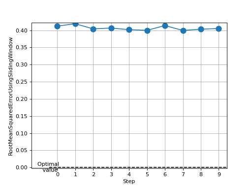 >>> # Example plotting multiple values >>> import torch >>> from torchmetrics.image import RootMeanSquaredErrorUsingSlidingWindow >>> metric = RootMeanSquaredErrorUsingSlidingWindow() >>> values = [ ] >>> for _ in range(10): ... values.append(metric(torch.rand(4, 3, 16, 16), torch.rand(4, 3, 16, 16))) >>> fig_, ax_ = metric.plot(values)