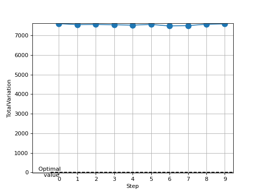 >>> # Example plotting multiple values >>> import torch >>> from torchmetrics.image import TotalVariation >>> metric = TotalVariation() >>> values = [ ] >>> for _ in range(10): ... values.append(metric(torch.rand(5, 3, 28, 28))) >>> fig_, ax_ = metric.plot(values)