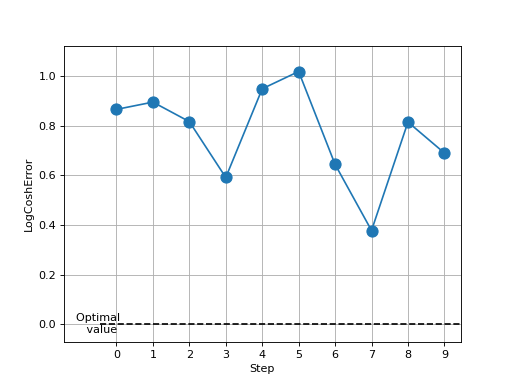 >>> from torch import randn >>> # Example plotting multiple values >>> from torchmetrics.regression import LogCoshError >>> metric = LogCoshError() >>> values = [] >>> for _ in range(10): ... values.append(metric(randn(10,), randn(10,))) >>> fig, ax = metric.plot(values)