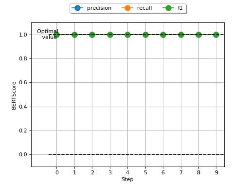 >>> # Example plotting multiple values >>> from torch import tensor >>> from torchmetrics.text.bert import BERTScore >>> preds = ["hello there", "general kenobi"] >>> target = ["hello there", "master kenobi"] >>> metric = BERTScore() >>> values = [] >>> for _ in range(10): ... val = metric(preds, target) ... val = {k: tensor(v).mean() for k,v in val.items()} # convert into single value per key ... values.append(val) >>> fig_, ax_ = metric.plot(values)