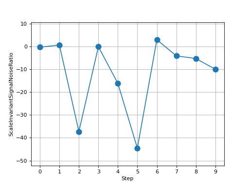 >>> # Example plotting multiple values >>> import torch >>> from torchmetrics.audio import ScaleInvariantSignalNoiseRatio >>> metric = ScaleInvariantSignalNoiseRatio() >>> values = [ ] >>> for _ in range(10): ... values.append(metric(torch.rand(4), torch.rand(4))) >>> fig_, ax_ = metric.plot(values)