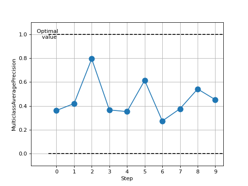 >>> # Example plotting multiple values >>> import torch >>> from torchmetrics.classification import MulticlassAveragePrecision >>> metric = MulticlassAveragePrecision(num_classes=3) >>> values = [ ] >>> for _ in range(10): ... values.append(metric(torch.randn(20, 3), torch.randint(3, (20,)))) >>> fig_, ax_ = metric.plot(values)