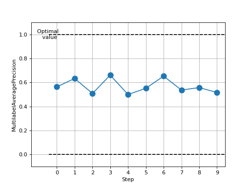 >>> # Example plotting multiple values >>> import torch >>> from torchmetrics.classification import MultilabelAveragePrecision >>> metric = MultilabelAveragePrecision(num_labels=3) >>> values = [ ] >>> for _ in range(10): ... values.append(metric(torch.rand(20,3), torch.randint(2, (20,3)))) >>> fig_, ax_ = metric.plot(values)
