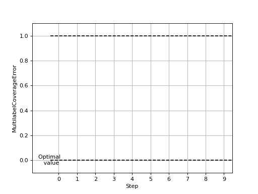 >>> from torch import rand, randint >>> # Example plotting multiple values >>> from torchmetrics.classification import MultilabelCoverageError >>> metric = MultilabelCoverageError(num_labels=3) >>> values = [ ] >>> for _ in range(10): ... values.append(metric(rand(20, 3), randint(2, (20, 3)))) >>> fig_, ax_ = metric.plot(values)