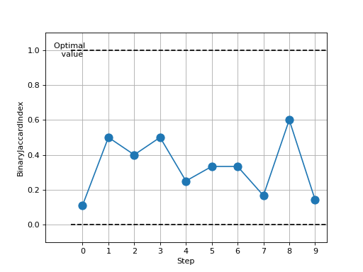 >>> # Example plotting multiple values >>> from torch import rand, randint >>> from torchmetrics.classification import BinaryJaccardIndex >>> metric = BinaryJaccardIndex() >>> values = [ ] >>> for _ in range(10): ... values.append(metric(rand(10), randint(2,(10,)))) >>> fig_, ax_ = metric.plot(values)