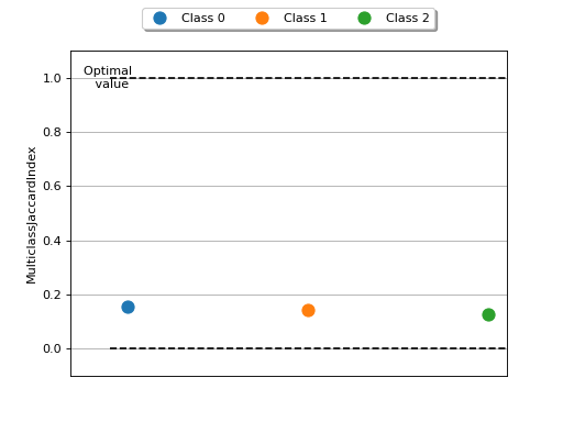 >>> # Example plotting a single value >>> from torch import rand, randint >>> from torchmetrics.classification import MultilabelJaccardIndex >>> metric = MultilabelJaccardIndex(num_labels=3) >>> metric.update(randint(2, (20, 3)), randint(2, (20, 3))) >>> fig_, ax_ = metric.plot()