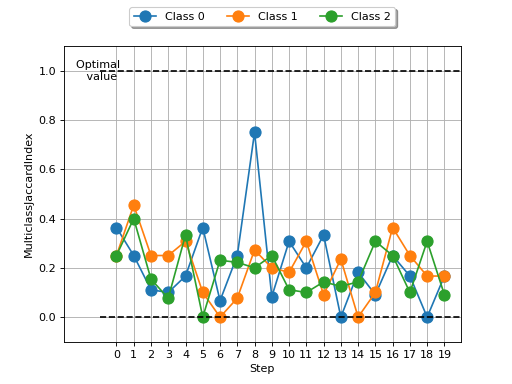 >>> # Example plotting a multiple values per class >>> from torch import randint >>> from torchmetrics.classification import MulticlassJaccardIndex >>> metric = MulticlassJaccardIndex(num_classes=3, average=None) >>> values = [] >>> for _ in range(20): ... values.append(metric(randint(3, (20,)), randint(3, (20,)))) >>> fig_, ax_ = metric.plot(values)