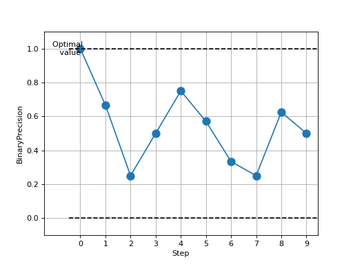>>> from torch import rand, randint >>> # Example plotting multiple values >>> from torchmetrics.classification import BinaryPrecision >>> metric = BinaryPrecision() >>> values = [ ] >>> for _ in range(10): ... values.append(metric(rand(10), randint(2,(10,)))) >>> fig_, ax_ = metric.plot(values)