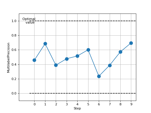 >>> from torch import rand, randint >>> # Example plotting multiple values >>> from torchmetrics.classification import MultilabelPrecision >>> metric = MultilabelPrecision(num_labels=3) >>> values = [ ] >>> for _ in range(10): ... values.append(metric(randint(2, (20, 3)), randint(2, (20, 3)))) >>> fig_, ax_ = metric.plot(values)