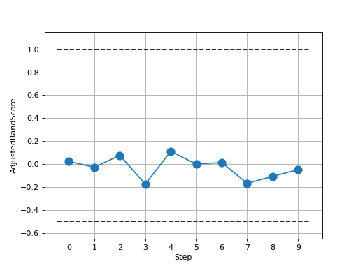 >>> # Example plotting multiple values >>> import torch >>> from torchmetrics.clustering import AdjustedRandScore >>> metric = AdjustedRandScore() >>> values = [ ] >>> for _ in range(10): ... values.append(metric(torch.randint(0, 4, (10,)), torch.randint(0, 4, (10,)))) >>> fig_, ax_ = metric.plot(values)