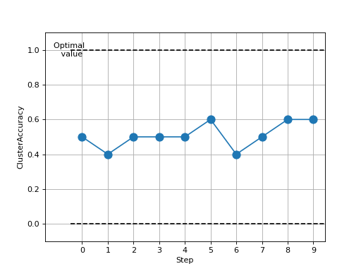 >>> # Example plotting multiple values >>> import torch >>> from torchmetrics.clustering import ClusterAccuracy >>> metric = ClusterAccuracy(num_classes=4) >>> values = [ ] >>> for _ in range(10): ... values.append(metric(torch.randint(0, 4, (10,)), torch.randint(0, 4, (10,)))) >>> fig_, ax_ = metric.plot(values)