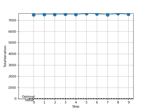 >>> # Example plotting multiple values >>> import torch >>> from torchmetrics.image import TotalVariation >>> metric = TotalVariation() >>> values = [ ] >>> for _ in range(10): ... values.append(metric(torch.rand(5, 3, 28, 28))) >>> fig_, ax_ = metric.plot(values)