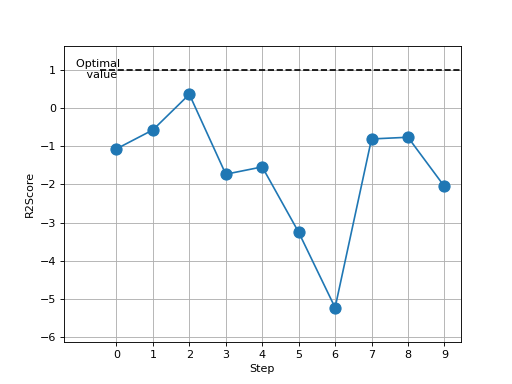>>> from torch import randn >>> # Example plotting multiple values >>> from torchmetrics.regression import R2Score >>> metric = R2Score() >>> values = [] >>> for _ in range(10): ... values.append(metric(randn(10,), randn(10,))) >>> fig, ax = metric.plot(values)