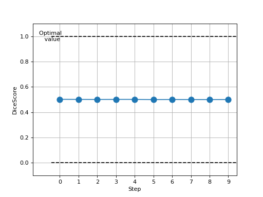 >>> # Example plotting multiple values >>> import torch >>> from torchmetrics.segmentation import DiceScore >>> metric = DiceScore(num_classes=3) >>> values = [ ] >>> for _ in range(10): ... values.append( ... metric(torch.randint(0, 2, (10, 3, 128, 128)), torch.randint(0, 2, (10, 3, 128, 128))) ... ) >>> fig_, ax_ = metric.plot(values)