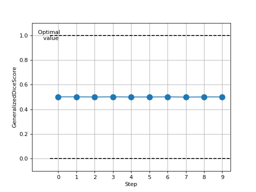 >>> # Example plotting multiple values >>> import torch >>> from torchmetrics.segmentation import GeneralizedDiceScore >>> metric = GeneralizedDiceScore(num_classes=3) >>> values = [ ] >>> for _ in range(10): ... values.append( ... metric(torch.randint(0, 2, (10, 3, 128, 128)), torch.randint(0, 2, (10, 3, 128, 128))) ... ) >>> fig_, ax_ = metric.plot(values)