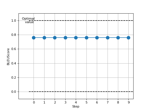 >>> # Example plotting multiple values >>> from torchmetrics.text import BLEUScore >>> metric = BLEUScore() >>> preds = ['the cat is on the mat'] >>> target = [['there is a cat on the mat', 'a cat is on the mat']] >>> values = [ ] >>> for _ in range(10): ... values.append(metric(preds, target)) >>> fig_, ax_ = metric.plot(values)
