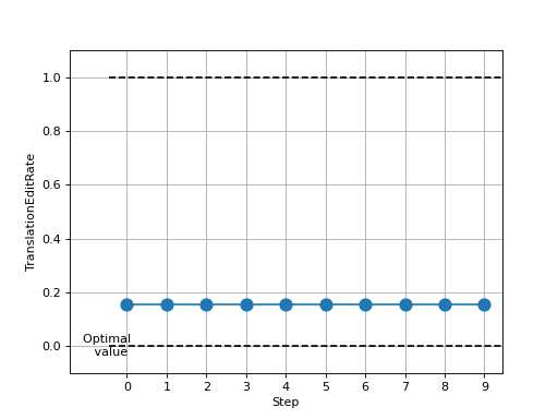 >>> # Example plotting multiple values >>> from torchmetrics.text import TranslationEditRate >>> metric = TranslationEditRate() >>> preds = ['the cat is on the mat'] >>> target = [['there is a cat on the mat', 'a cat is on the mat']] >>> values = [ ] >>> for _ in range(10): ... values.append(metric(preds, target)) >>> fig_, ax_ = metric.plot(values)