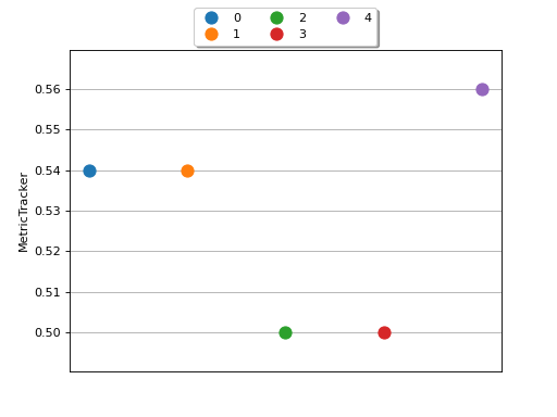 >>> # Example plotting a single value >>> import torch >>> from torchmetrics.wrappers import MetricTracker >>> from torchmetrics.classification import BinaryAccuracy >>> tracker = MetricTracker(BinaryAccuracy(), maximize=True) >>> for epoch in range(5): ... tracker.increment() ... for batch_idx in range(5): ... tracker.update(torch.randint(2, (10,)), torch.randint(2, (10,))) >>> fig_, ax_ = tracker.plot() # plot all epochs